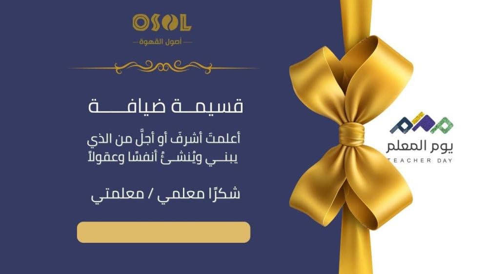 بطاقة ضيافة بمناسبة يوم المعلم أهداء لمعلمك ومعلمتك يتم التواصل مع الشخص المهدى له مباشرة بعد تأكيد الشراء يرجى كتابة أسم الشخص الذي سوف تقدم له الهدية ورقم جواله في صندوق الملاحظات حتى يتم التواصل معه والتنسيق للحصول على الضيافة